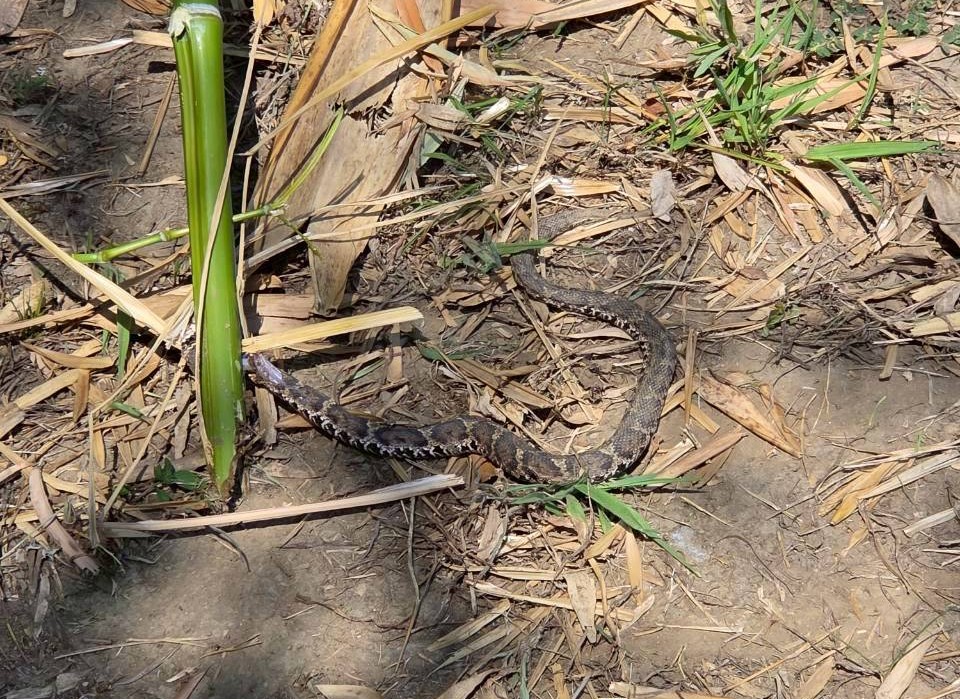 刈り取った稲を軽トラのコンテナに出すところまで間近で見ていただき作業終了となりました。作業中マムシに出会わなくてよかったですね(近くの田んぼで発見したマムシを干して注意喚起をしていました)。